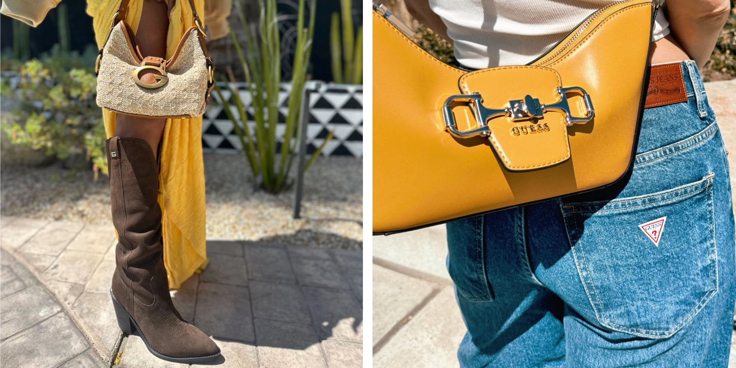 Chalk it up to renewed interest in Carolyn Bessette Kennedy's style, or perhaps we were all on the same wavelength, but senior style director Jessica Andrews and I felt that same influence. We selected pieces from Guess's Festival edit not just for the weekend, but for the long term. Our shoulder bags, embellished with Guess's iconic hardware, scream summer in their own ways, be it the dopamine hit of marigold or the raffia texture. And Jess's suede cowboy boots are clearly appropriate for all seasons.