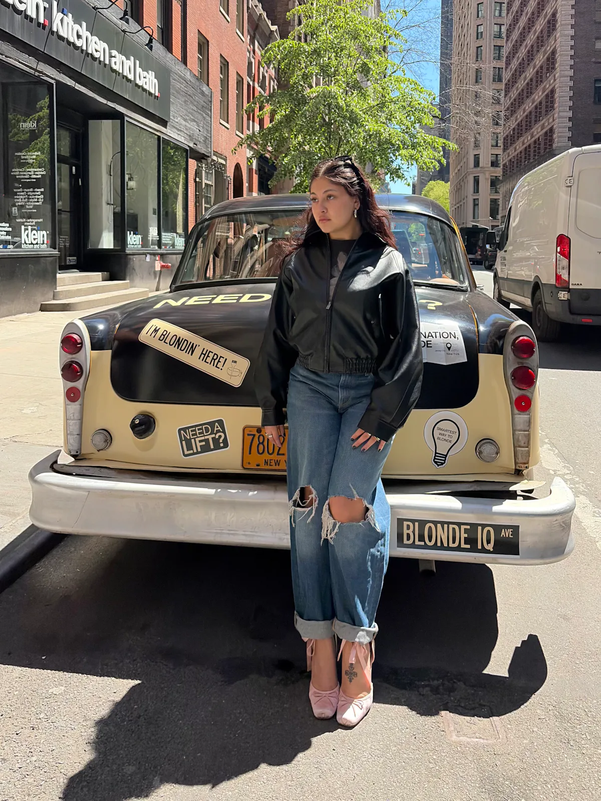 “I love low-rise baggy jeans for their effortless versatility. Whether worn slung low or sitting closer to mid-rise, they adapt to the mood of the day while maintaining a strong silhouette. Styled with flats or boots, the denim never misses. For this look, I styled my baggy jeans with black boots — while it may read a little fall, NYC’s unpredictable weather definitely influenced the look. I draped a sarong over the denim to create movement and depth, elevating the silhouette while keeping the jeans as the focal point. I finished the outfit with a lightweight bomber jacket with a floral brooch to bring in spring vibes.”