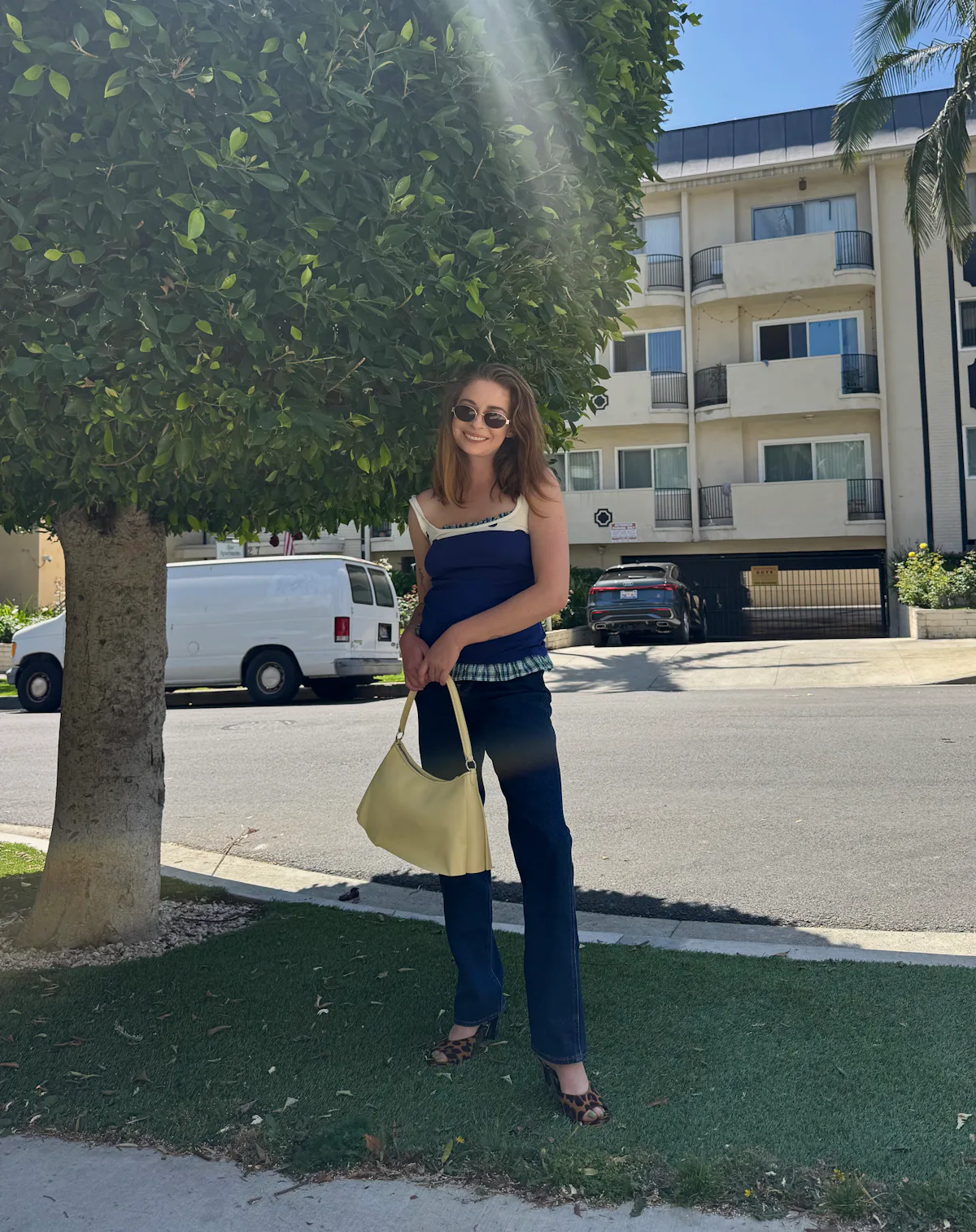 “Considering I’m only 5’2”, finding denim that doesn’t overwhelm my frame is never easy — styles are often either too baggy or too long. That said, I was pleasantly surprised by how well Calvin Klein’s ‘90s straight-leg jeans fit. They are slightly long on me, but nothing a pump can’t fix (though I’ll likely have them tailored eventually). I typically gravitate toward medium washes, but I love the look of this darker pair. Styled with a cute top like this Damson Madder tank and statement heels, the jeans make the perfect base.”